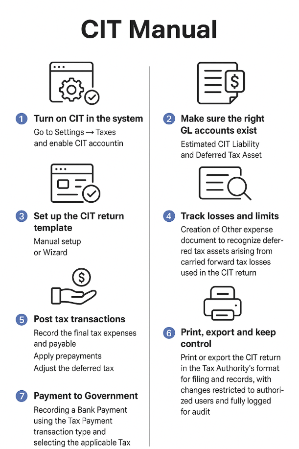Administration → Settings: Taxes → Enable CIT Accounting.