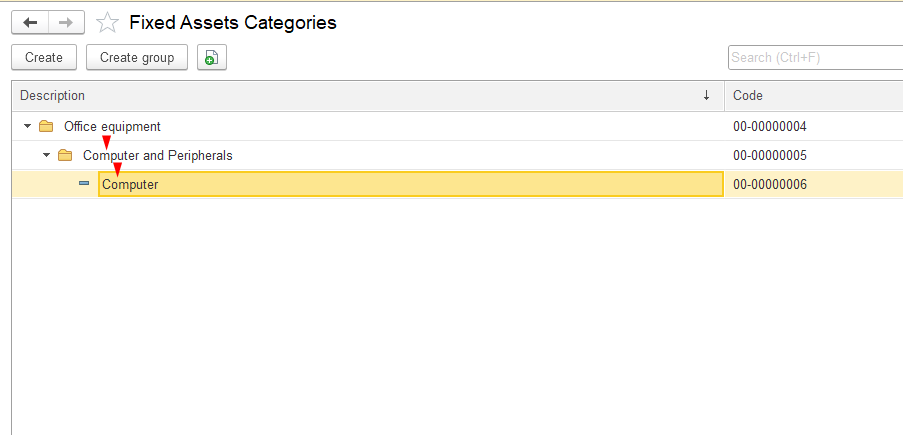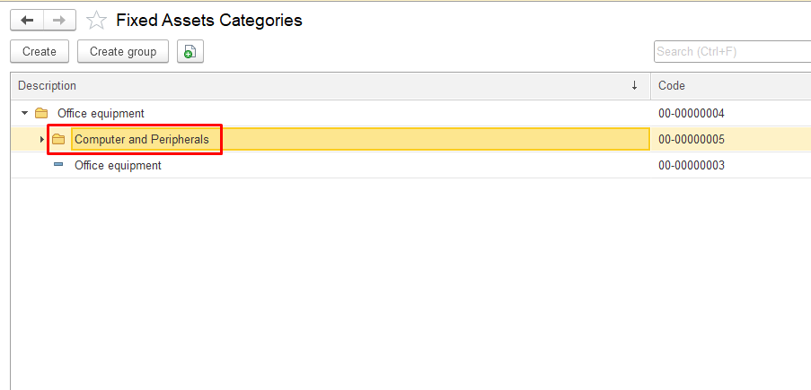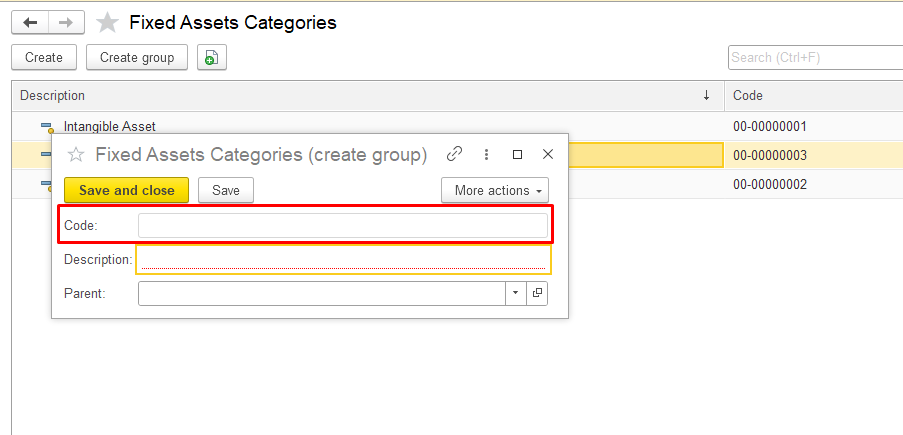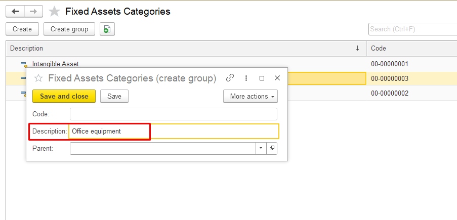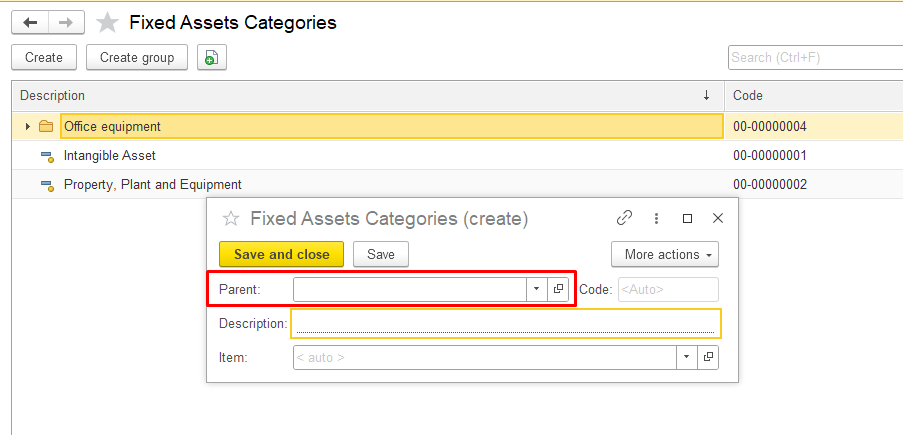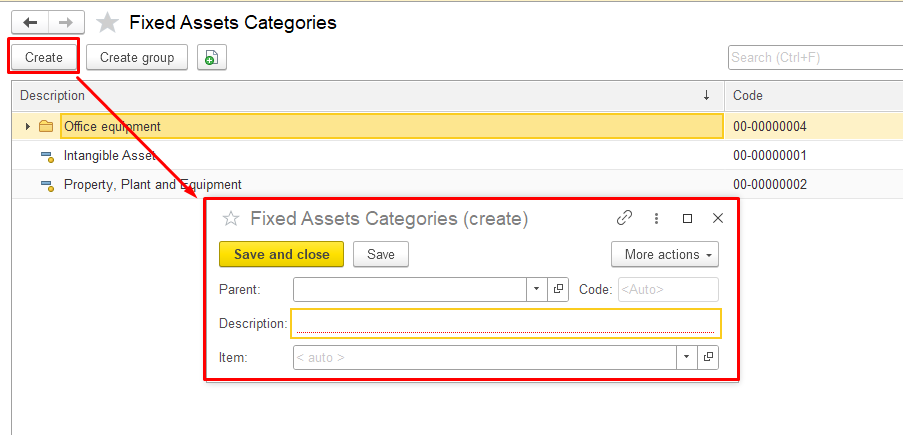Open the Fixed Assets Categories section in the system, click the Create group button at the top and in the pop-up window, fill in the required fields: