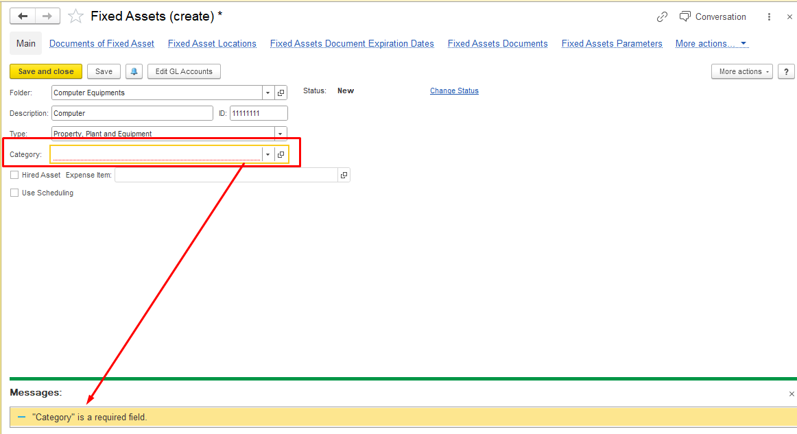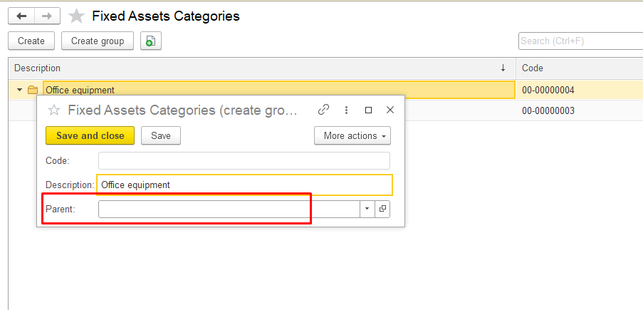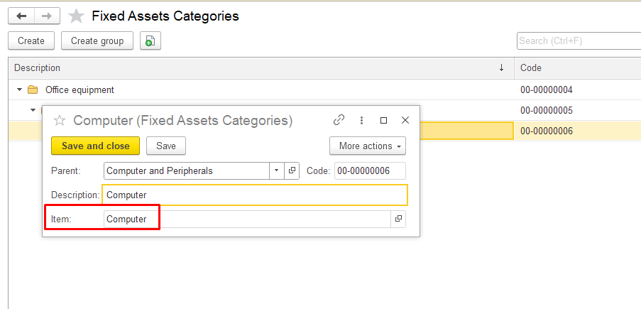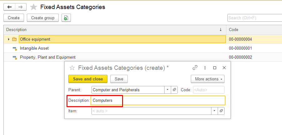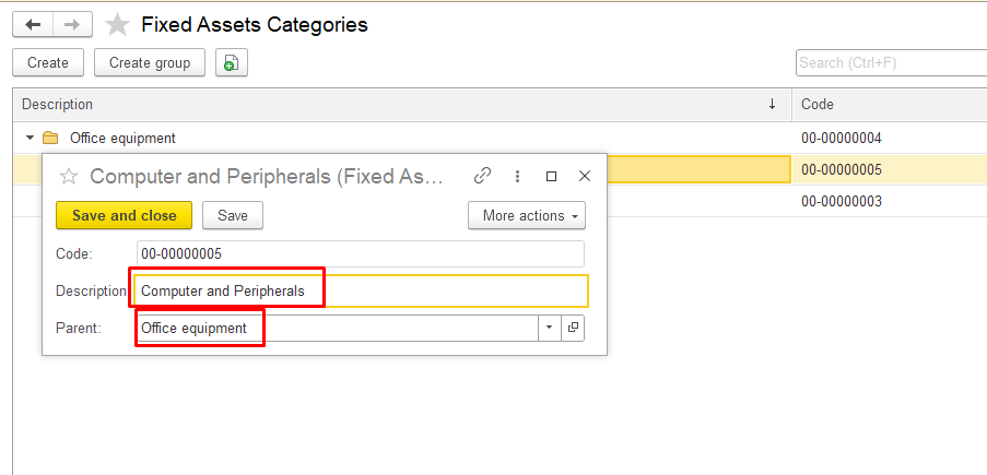 Click Save and close to save the new category. The new category will appear in the list of fixed asset categories or in the parent group.