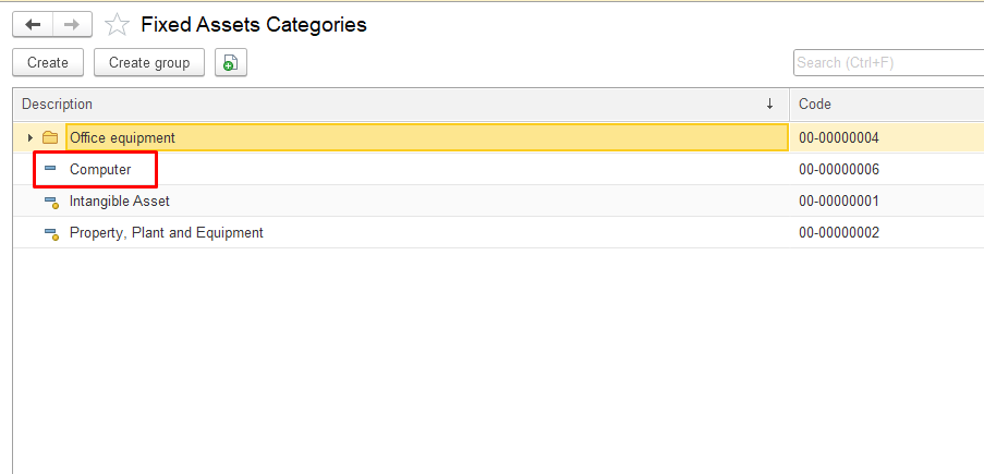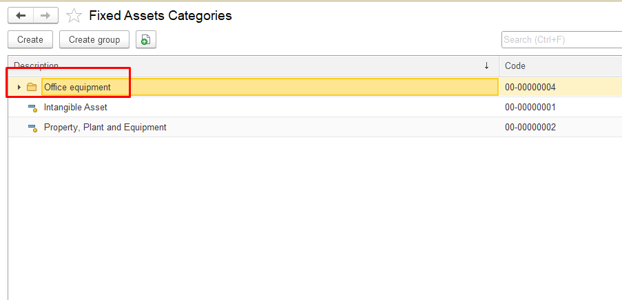To create a Fixed Asset Category inside an existing group or as a separate category click Create button at the top and in the pop-up window, fill in the required fields:
