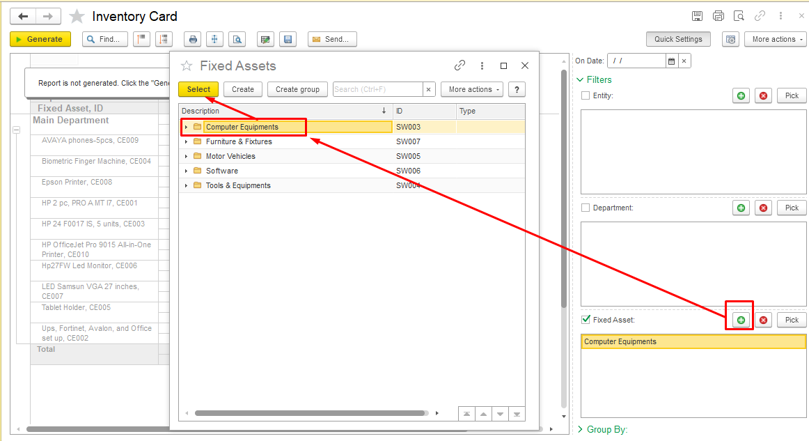 To do this, in the report Filters, in the Fixed Asset field, click the “+” (plus) button to add an object. In the new window, select the required category.
