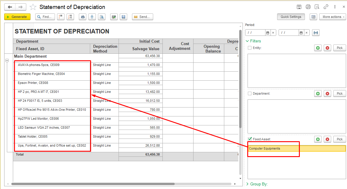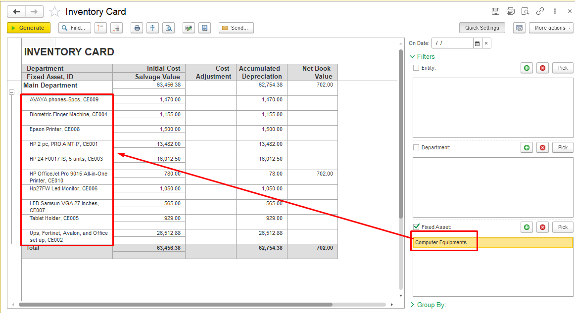 Reports on Fixed Assets can be generated both by category and for individual Fixed Assets, such as the Inventory Card and the Statement of Depreciation.