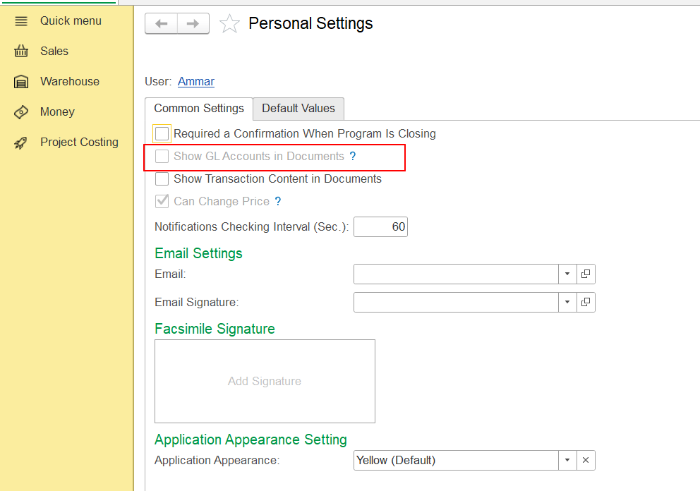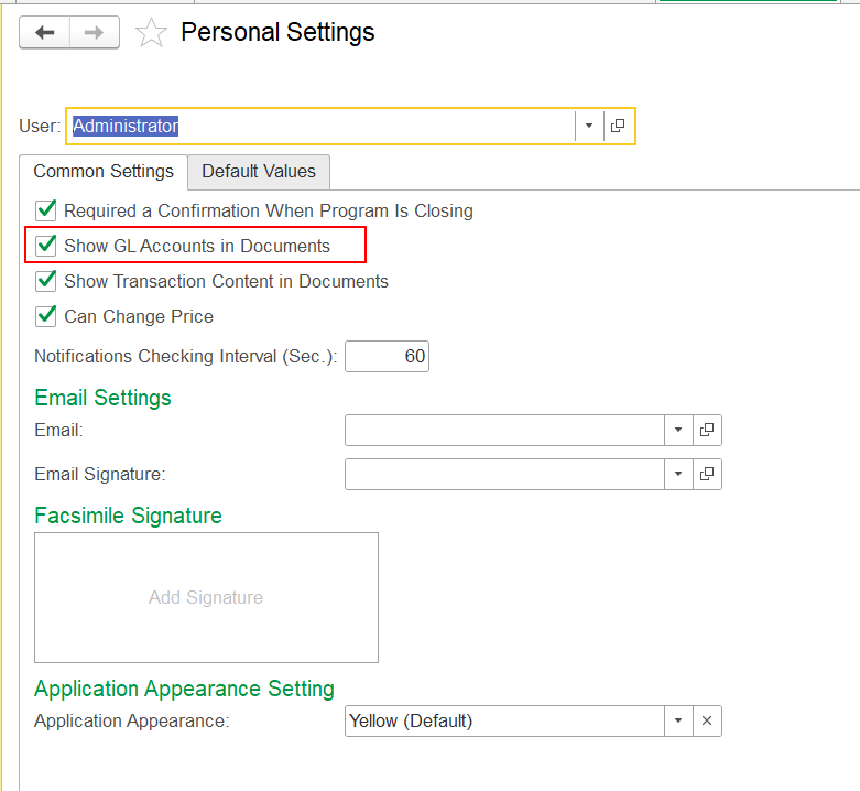 3. In Personal Settings, on Common Settings tab it is needed to put a tick in checkbox for Show GL Accounts in Documents: