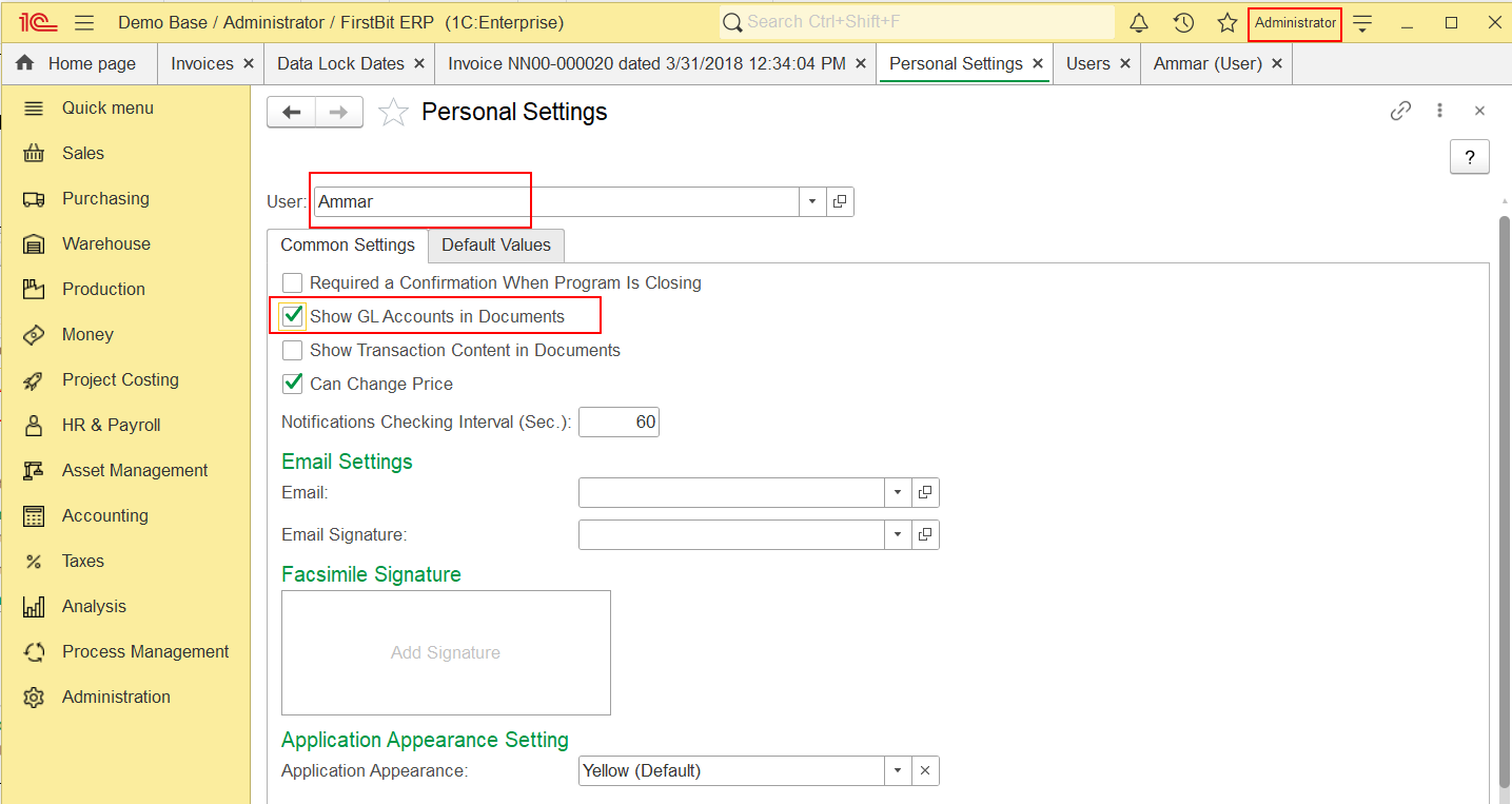 Example: Ammar user does not have access rights to set GL Accounts visibility individually under Ammar user: