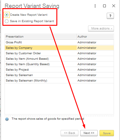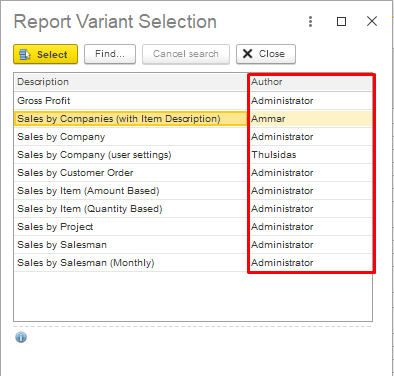 In Report Variant Selection window user can see all saved report variants - and also user may check - was it created by developers (author - Administrator) or by users (in this case in author would be name of users, who made new report variant).