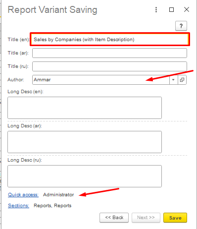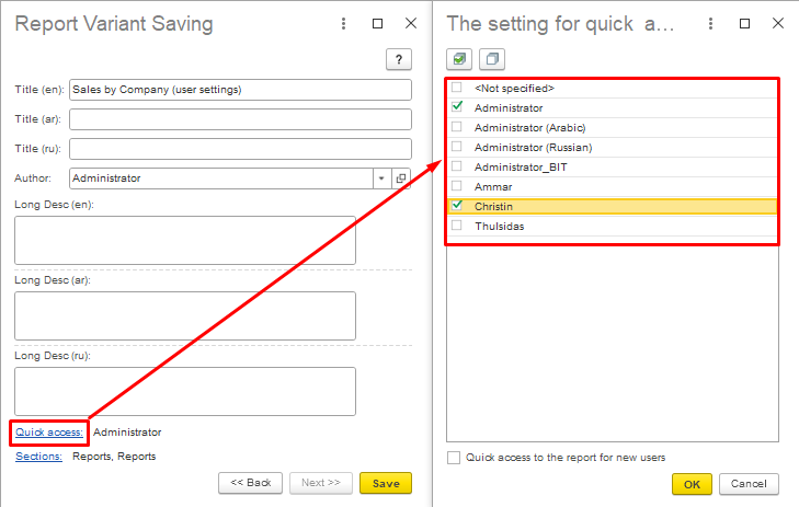Author of new report variant also may give to another users rights to see new report variant in their quick access for current report with making settings in Quick Access option.