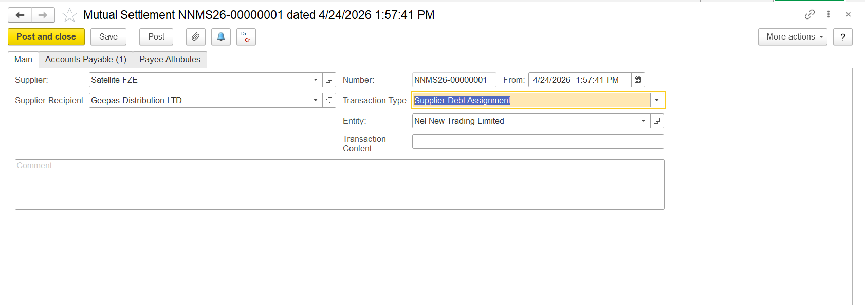 2. At the Main tab, choose Transaction Type - Supplier Debt Assignment