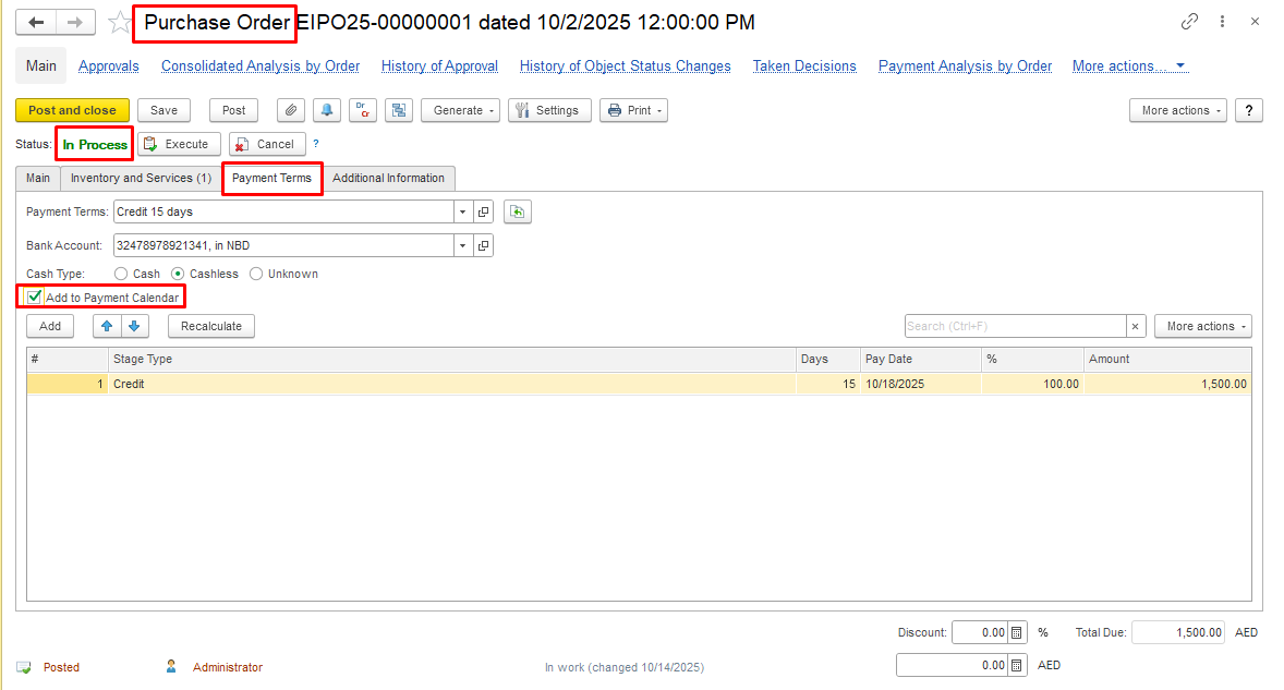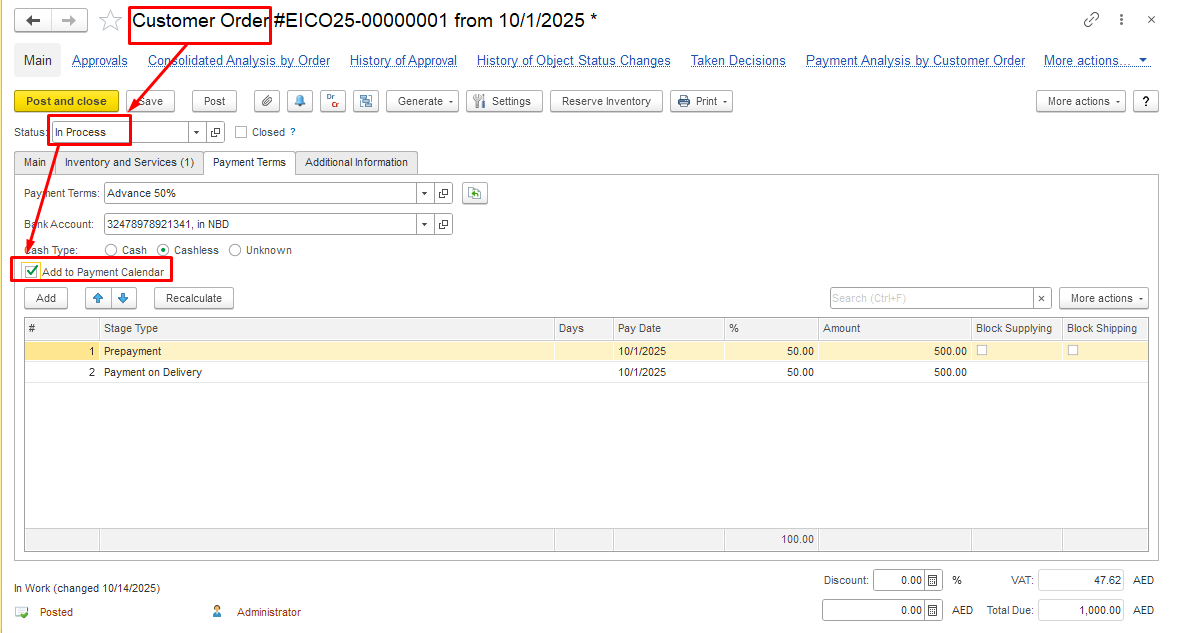 To include planned payments from the customer/supplier in the payment calendar as planned payments of the selected payment type, select the Add to Payment Calendar option on the Payment Terms tab . By default, the "Add to payment Calendar" field is not active. In order to activate it, the document status must be "In Process". This setting is valid for the documents Customer Order and Purchase Order.