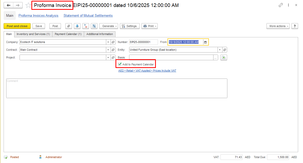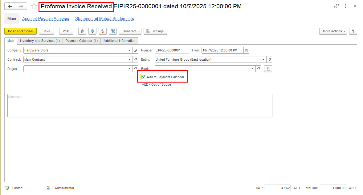 For Proforma Invoice and Proforma Invoice Received documents, tick the "Add to Payment Calendar" field on the Main tab.