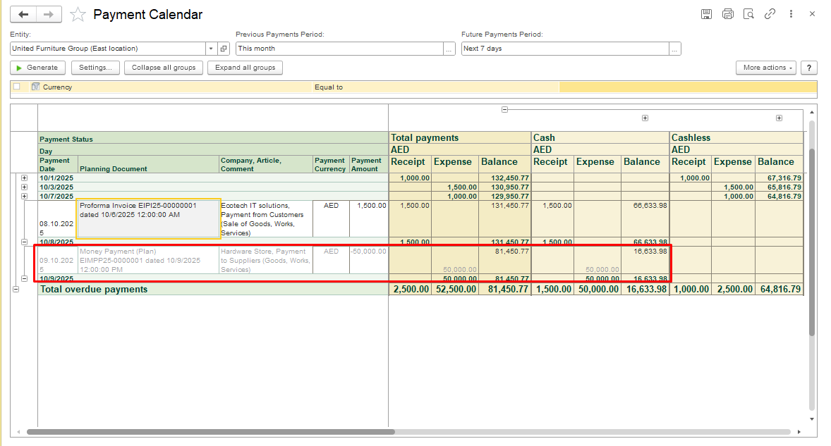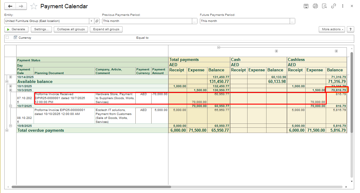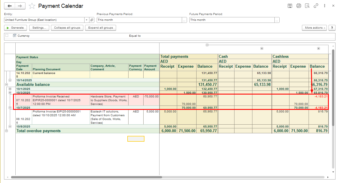 In FirstBit, the Payment Calendar clearly shows this situation - when the daily balance becomes negative (displayed in red), it means a cash gap is forecasted for that day.