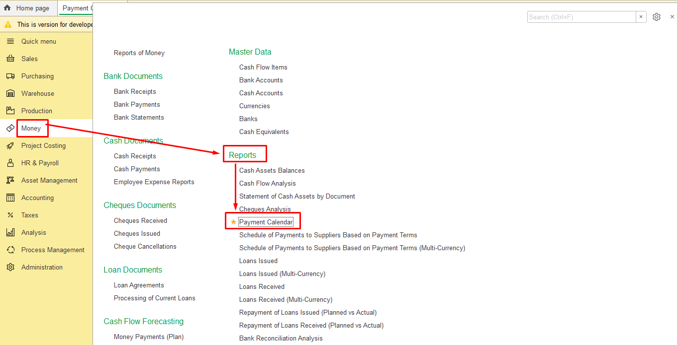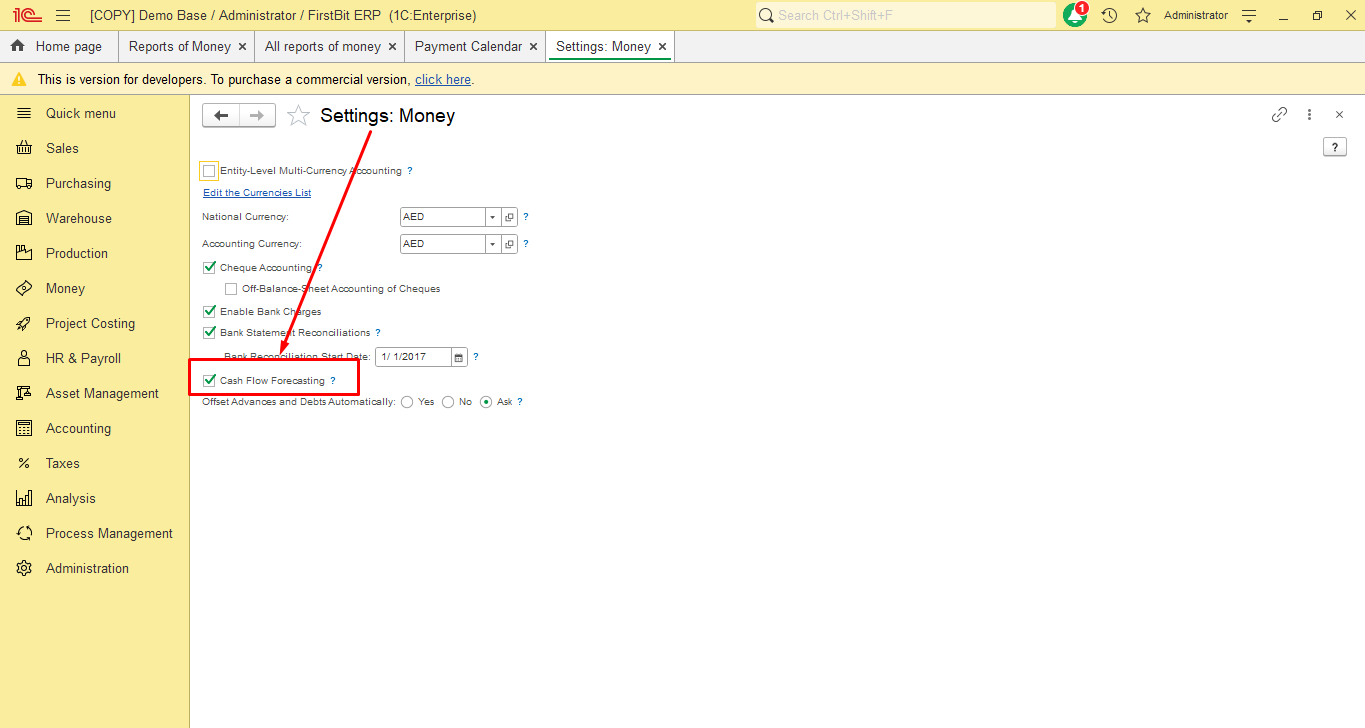 To start using the "Payment Calendar" feature, please check the settings, navigate to Administration > Settings > Money → put a check mark in the field "Cash Flow Forecasting"