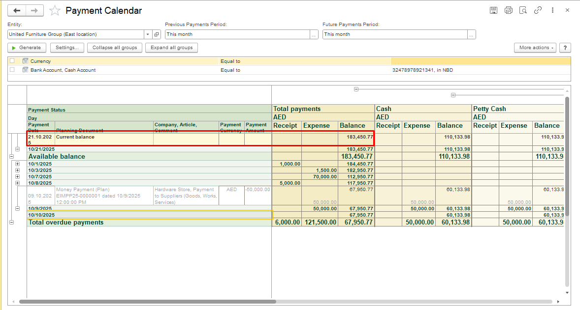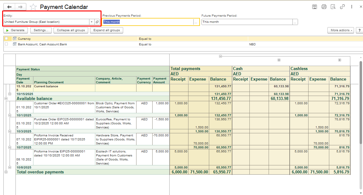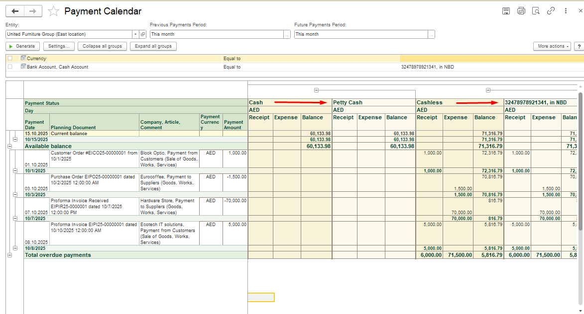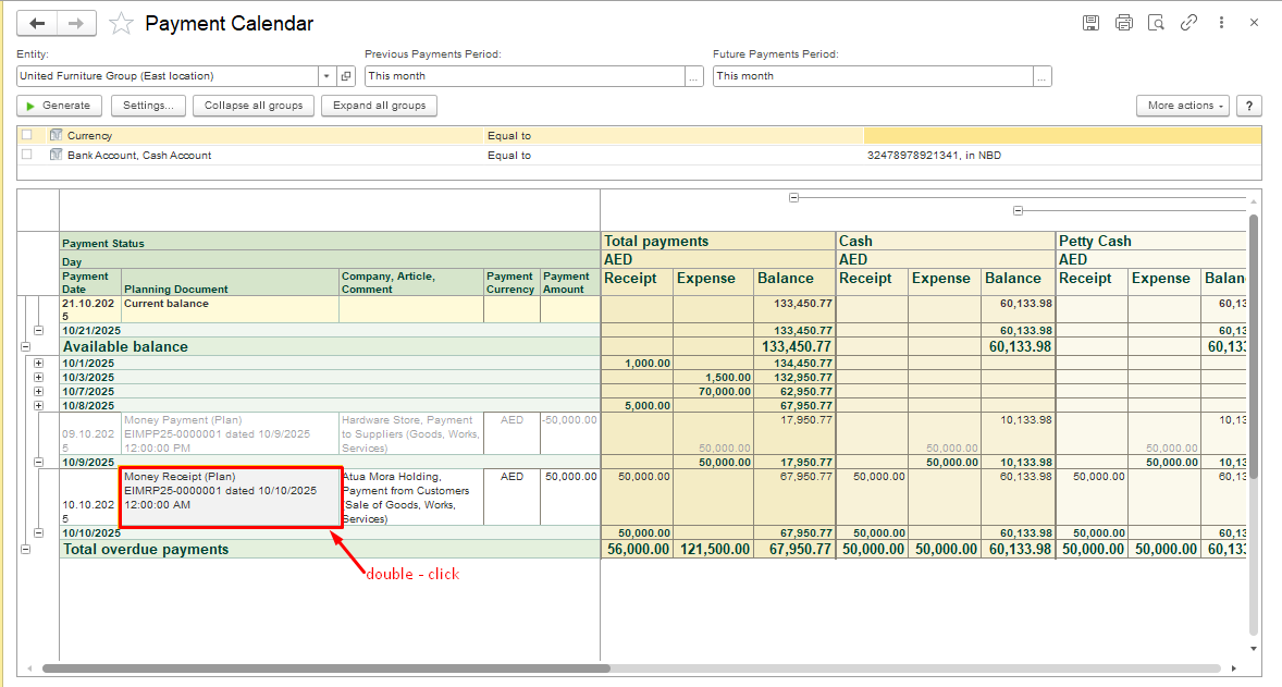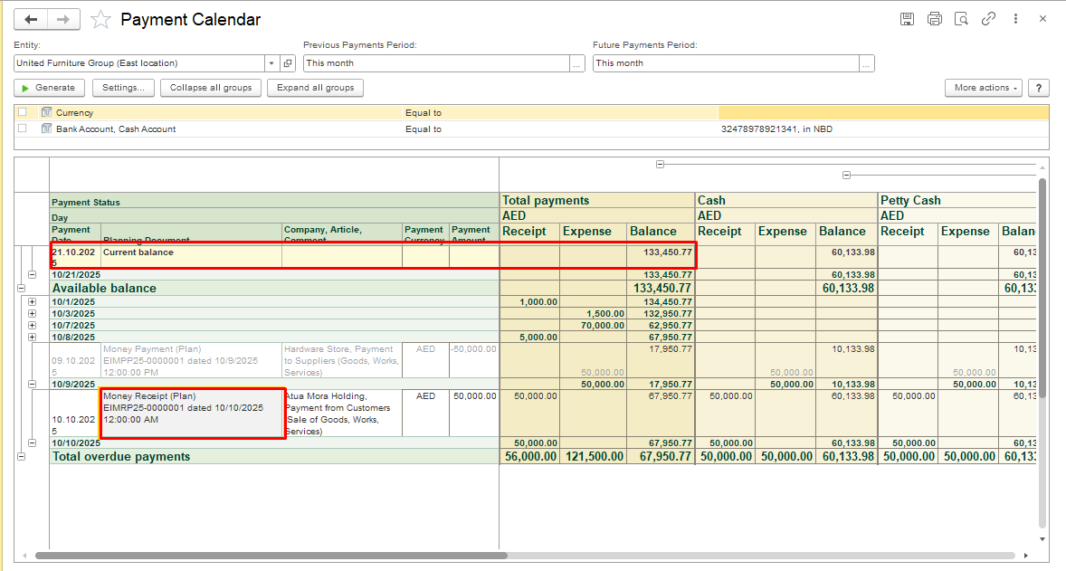 By default, the calendar generates cash flows for all accounts of the entity, including Bank account and Cash account, with details for each type of account.