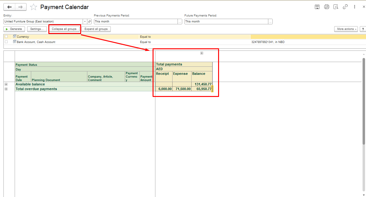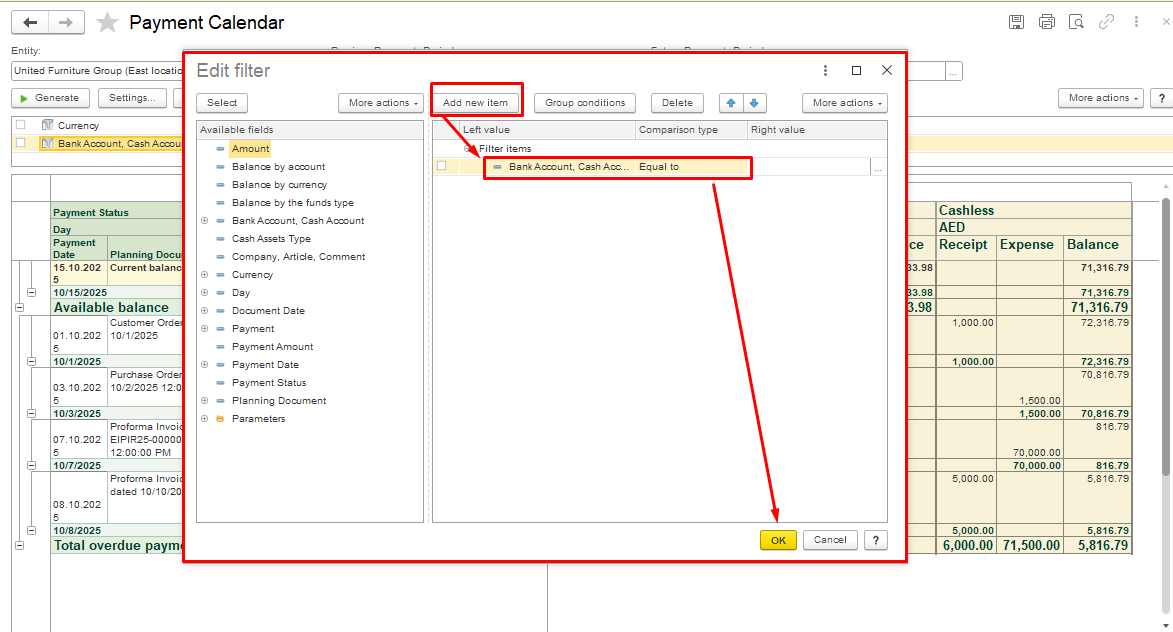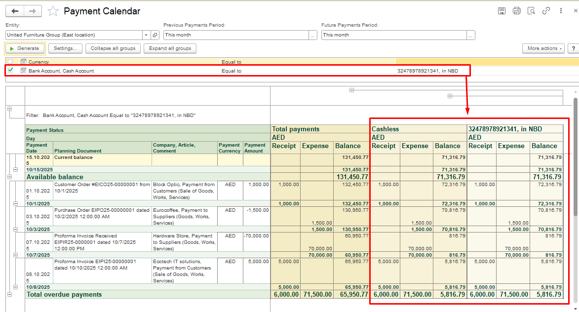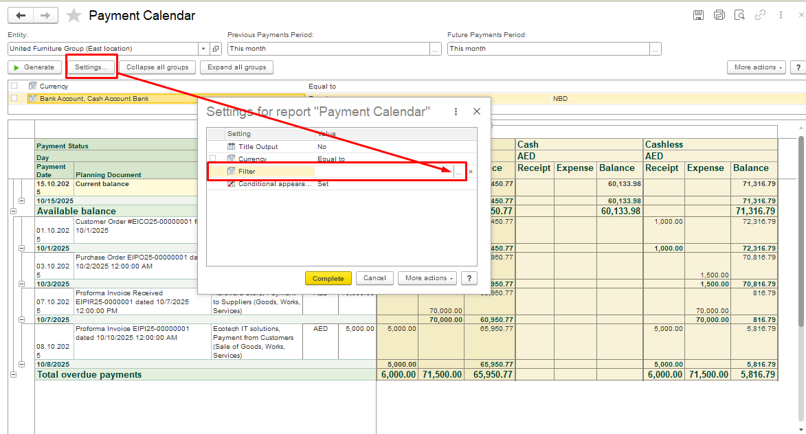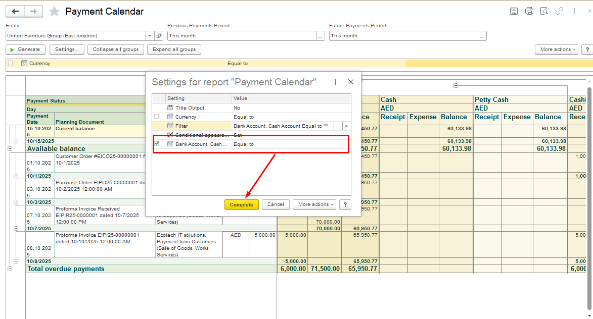 In the dialogue box Settings for report "Payment Calendar", a new Bank Account filter has been added, click Complete to save the settings. Now you can filter the report by a specific bank account.