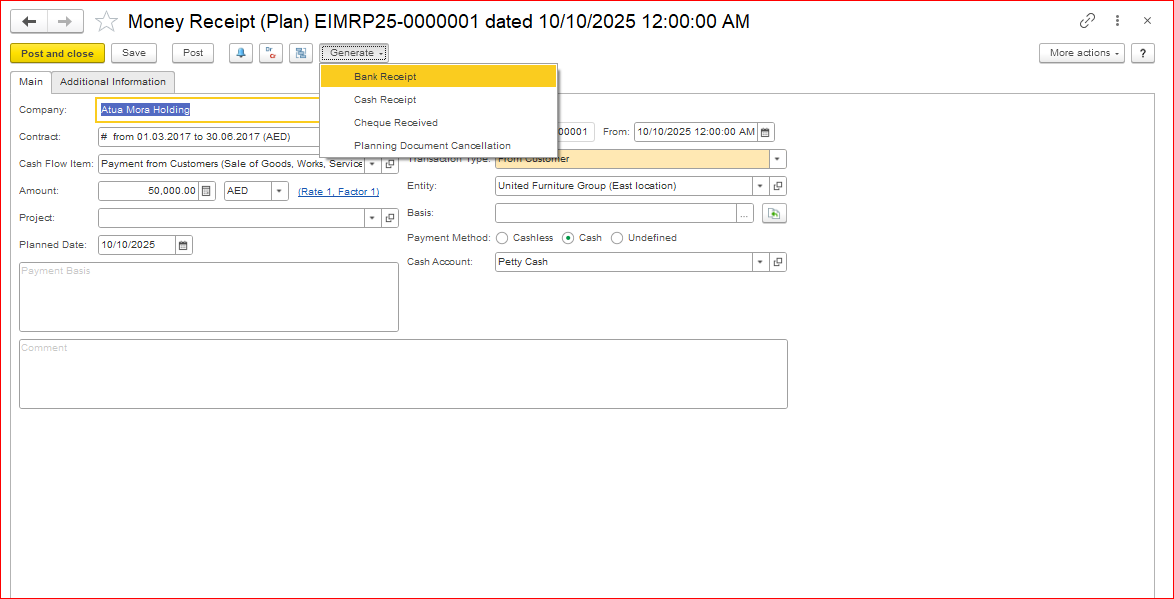 Click Generate and select the required document - Bank, Cash or Cheque. You may also cancel the planning document.
