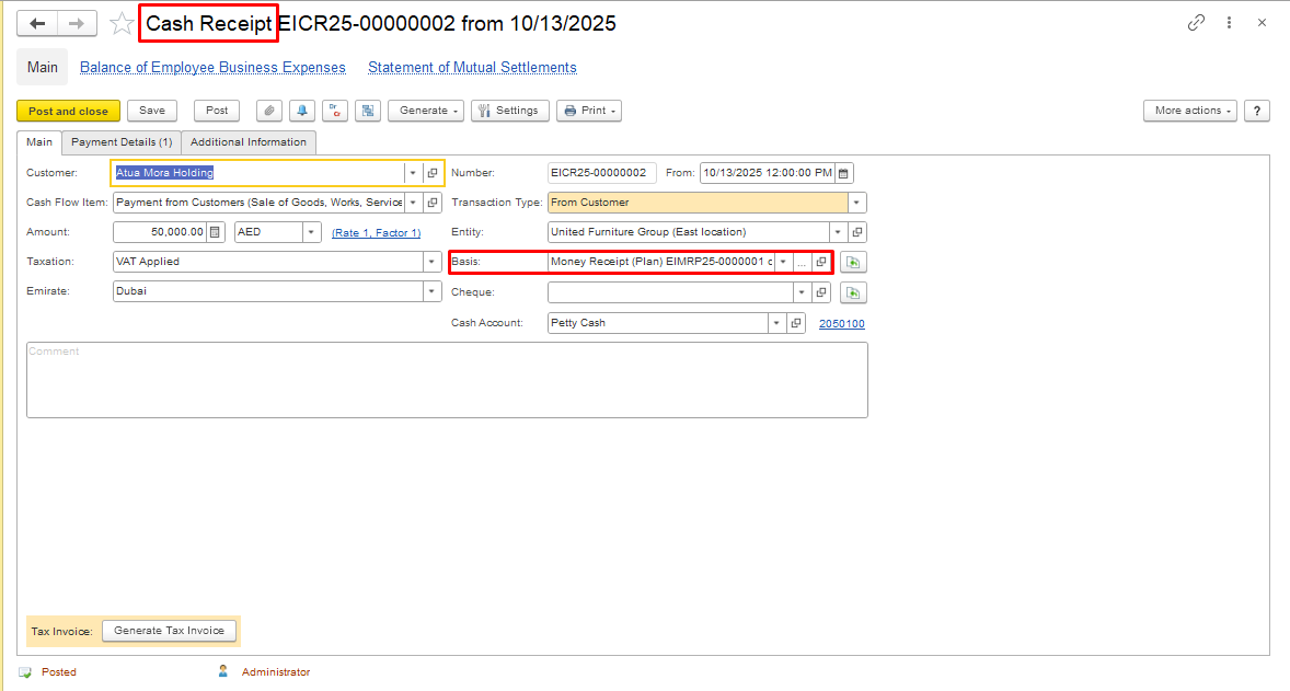 Once you create and post the actual Bank/Cash/Cheque document, the planned operation is automatically removed from the plan section of the Payment Calendar and recorded as executed. The calendar view updates to reflect the change in current balances as of the transaction date. At the same time, the planning document will appear in the payment document as a Basis.