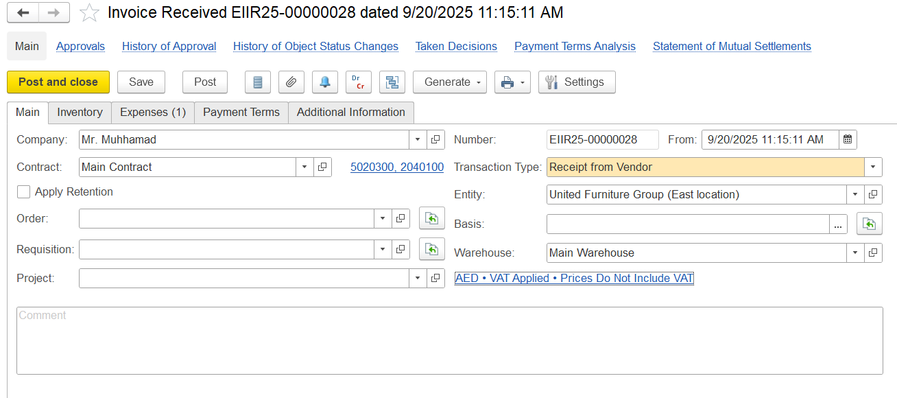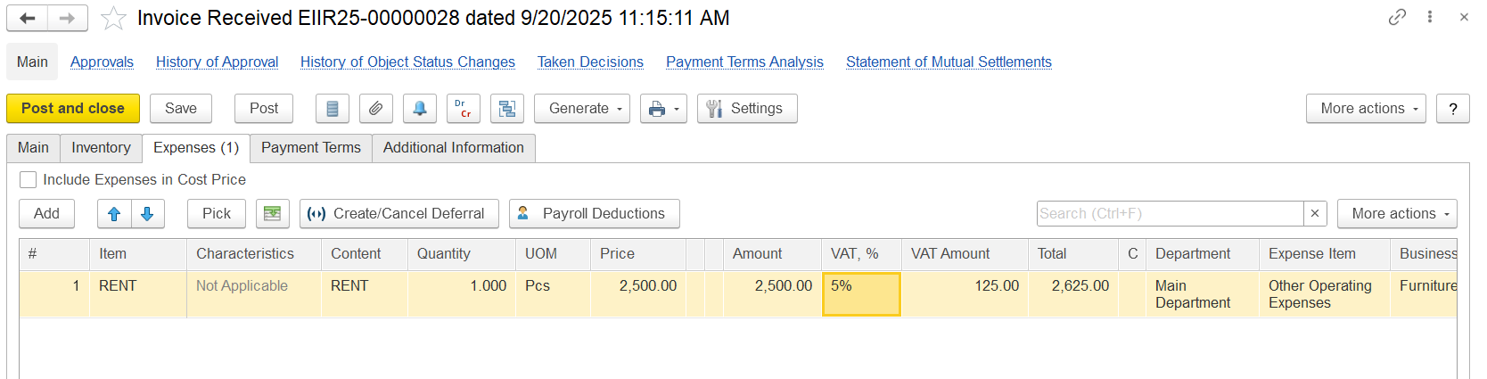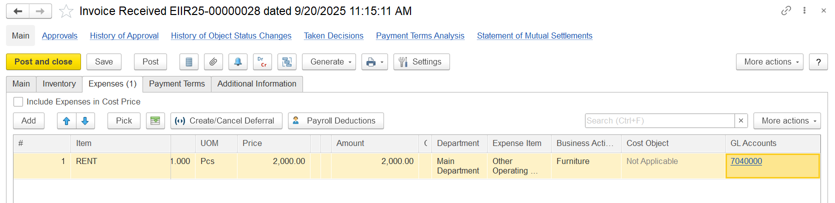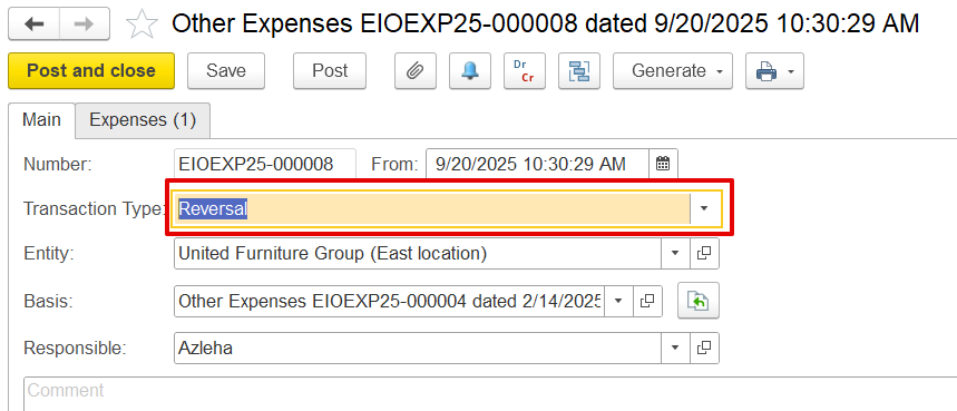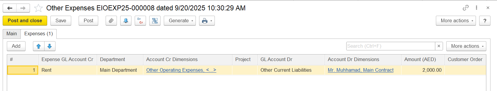 Create the document either by using the Generate option from the initial document or by manually creating an Other Expense document and filling in the required details.