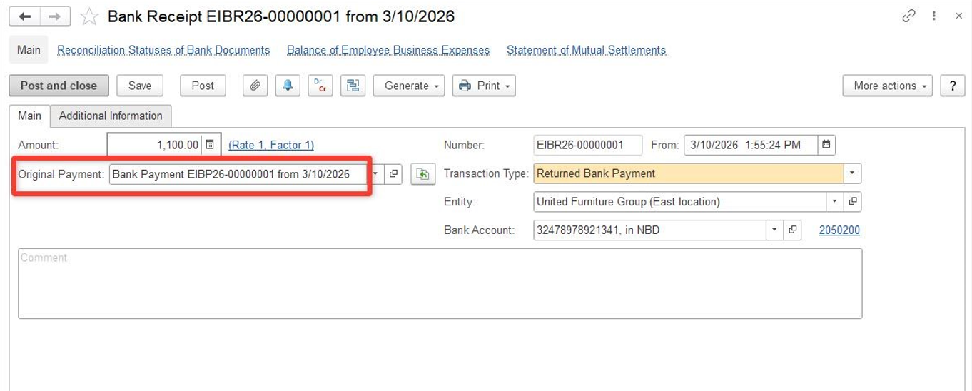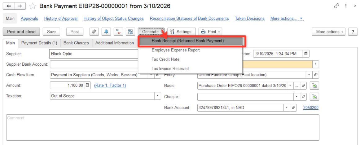 1. To record payment, create Bank Receipt (Returned Bank Payment) document from "Generate" button of the original Bank Payment: