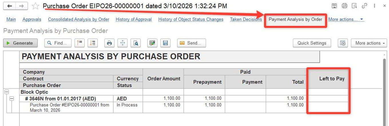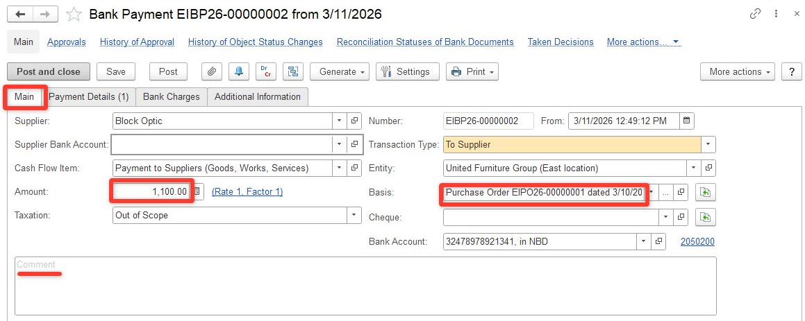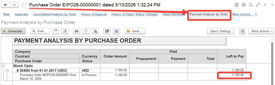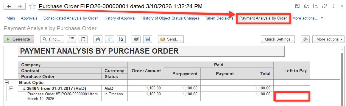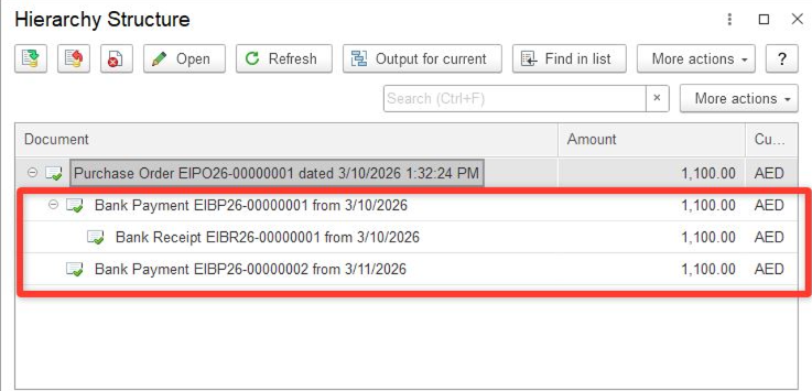 4. As Bank Payment is recorded, the basis document (there is a Purchase Order in our example) is paid: